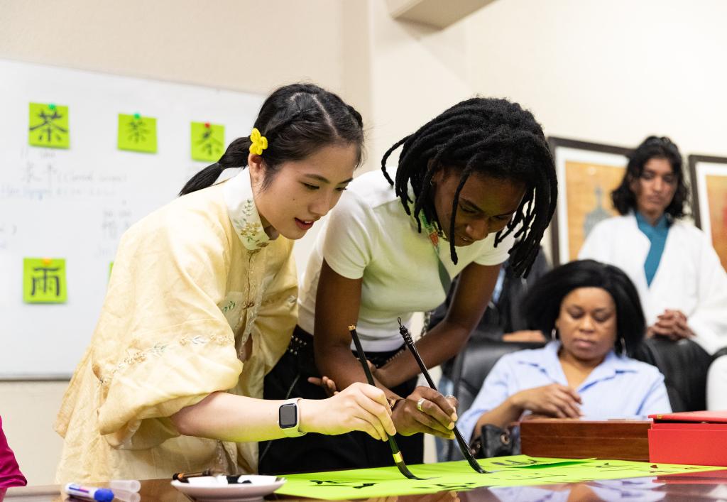 2025年4月17日,在南非约翰内斯堡,学生与孔子学院志愿者在“国际中文日”活动上写毛笔字。新华社记者 张誉东 摄