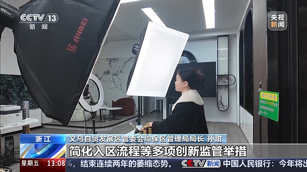 义乌自贸发展区管委会综保区管理局局长 孙甜:综保区是海关特殊监管区域,属于“境内关外”。我们成立了保税直播工作专班,和义乌海关共同推出线上活动备案、简化入区流程等多项创新监管举措,为企业开辟保税直播“绿色通道”,为企业入区直播提供便利。