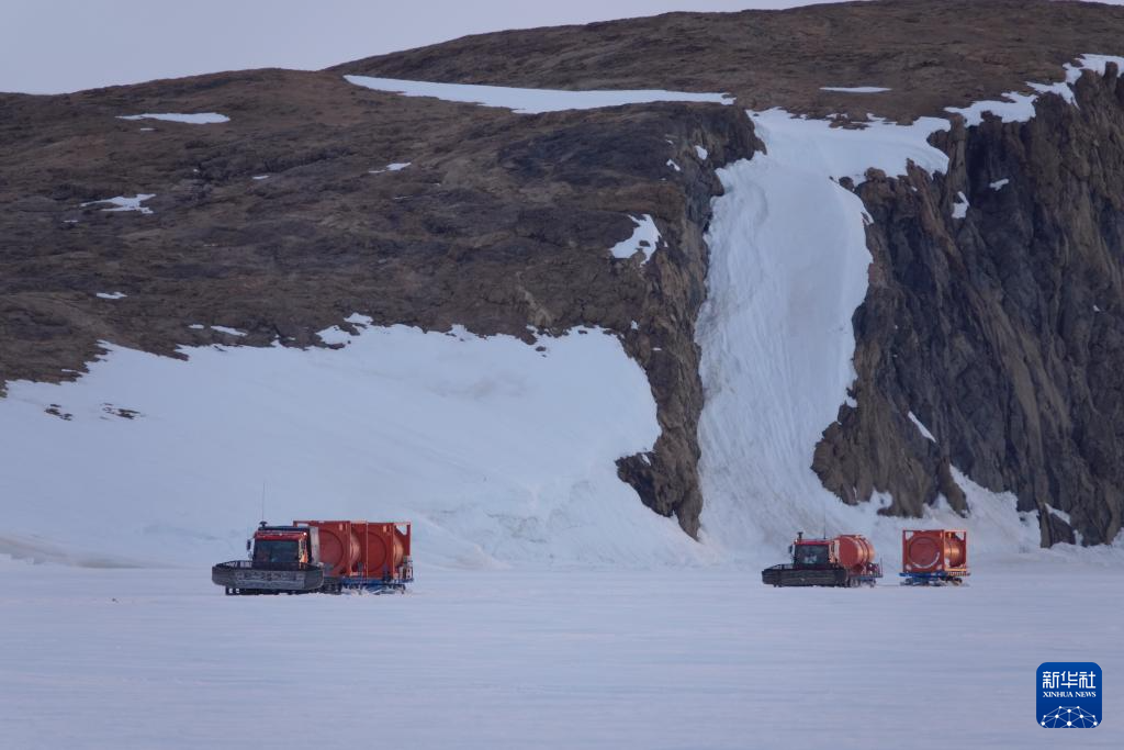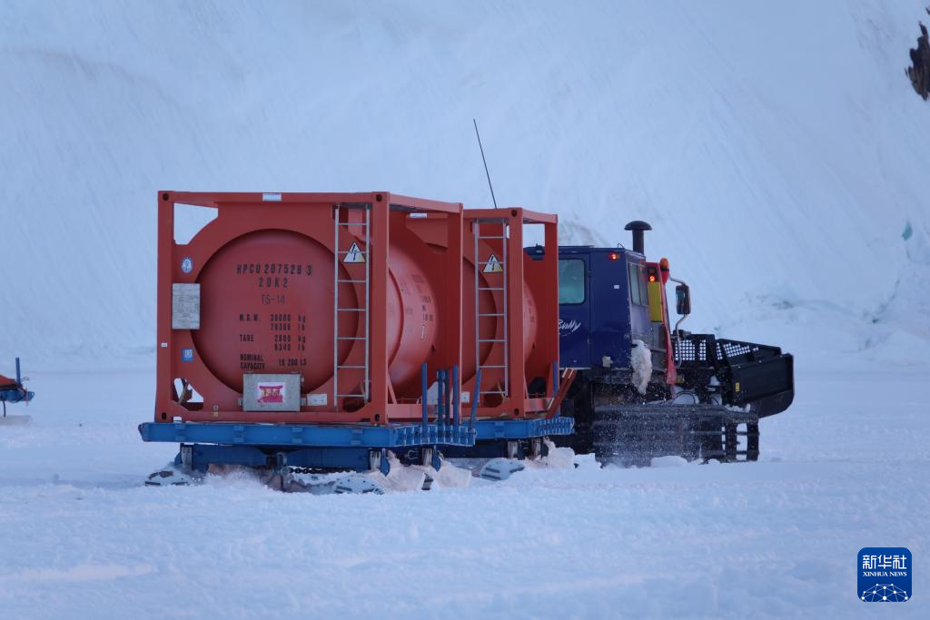 北京时间12月3日凌晨,雪地车拉着加满燃油的油罐离开“雪龙2”号,驶向中山站。新华社记者 顾天成 摄