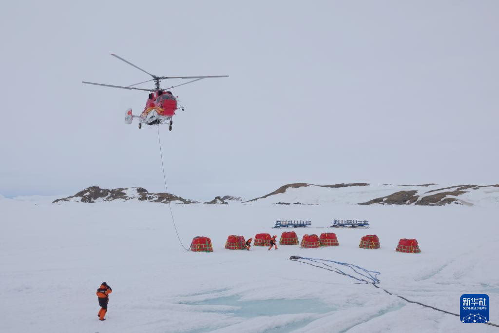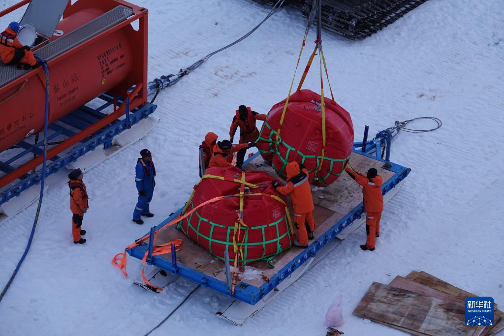 据悉,“雪龙2”号正采取“白天空吊、夜晚冰运”的节奏开展物资和燃油卸运,白天利用直升机吊挂油囊,夜间趁低温海冰承载力较好时开展冰面车辆雪橇运输。