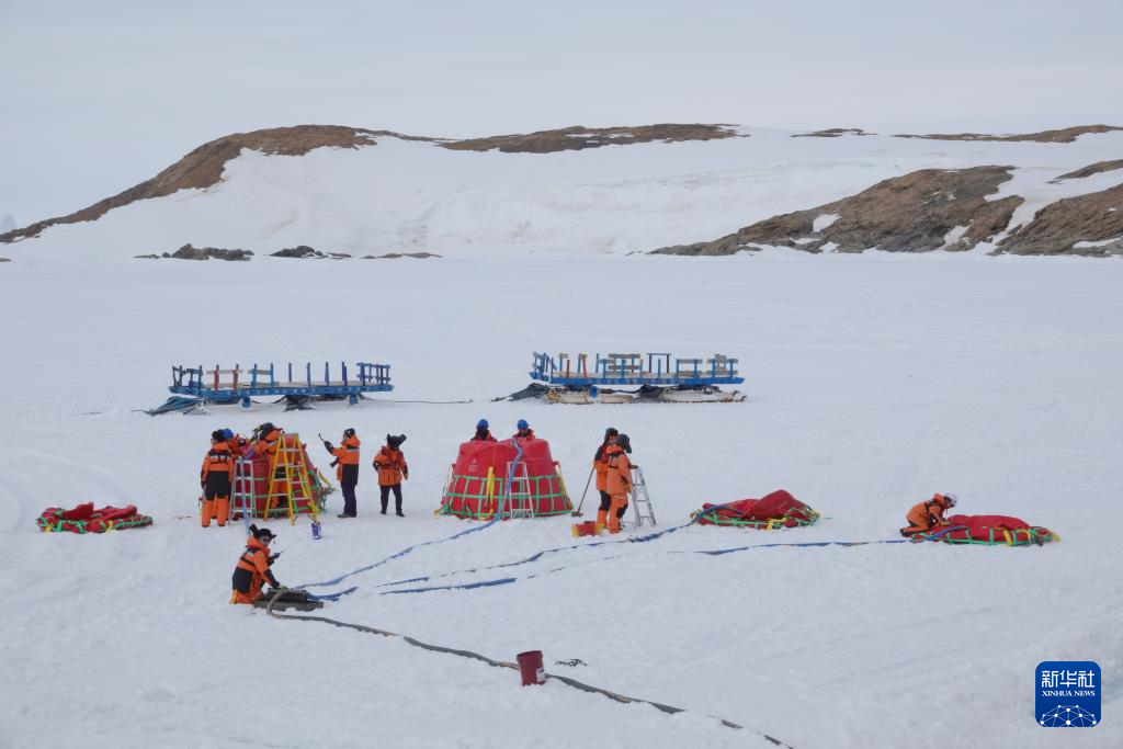 北京时间12月2日傍晚,工作人员在冰面上进行油囊加注作业。新华社记者 顾天成 摄