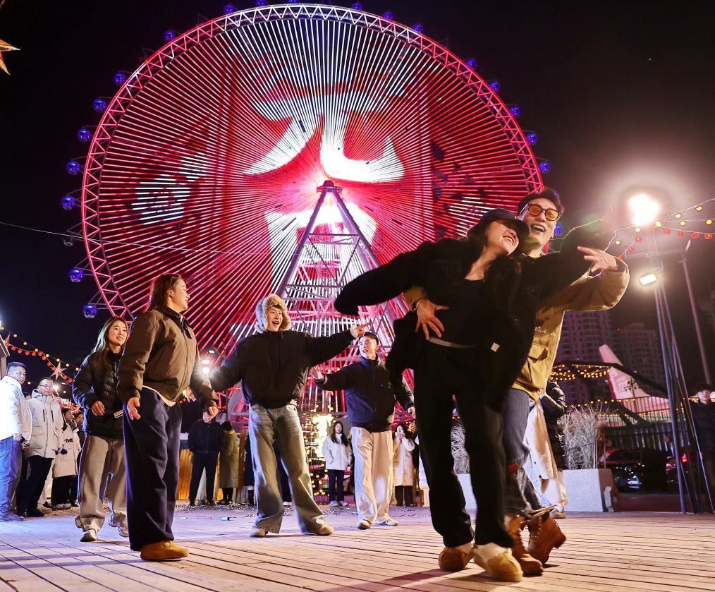 1月1日凌晨,游客在河北省秦皇岛市海港区的摩天轮前跳舞,迎接新年的到来。新华社发(曹建雄摄)